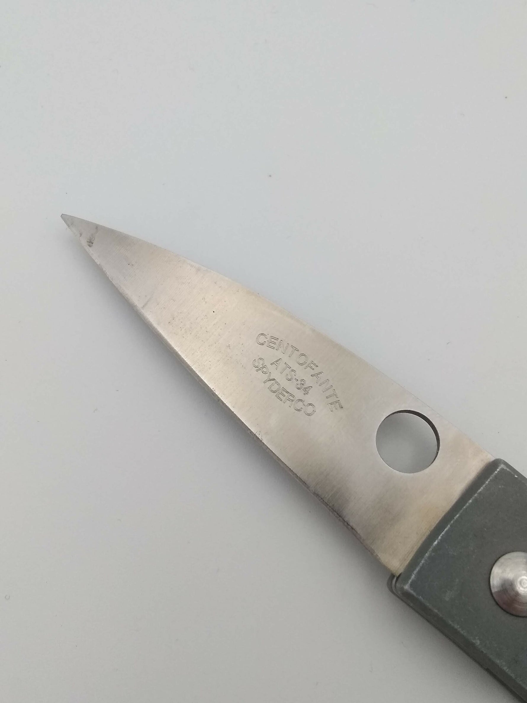 BRAND: Spyderco KnivesPRODUCT TYPE: KnivesPRODUCT CATEGORY: FoldingOVERALL LENGTH: 6.81"CLOSED LENGTH: 4.00"BLADE LENGTH: 2.81"BLADE STEEL: ATS 34BLADE TYPE: WharncliffeBLADE GRIND: FlatLOCKING MECHANISM: Liner LockHANDLE MATERIAL: Aluminum, RubberCARRY: Tip-DownOPENING MECHANISM: Thumb HoleDESIGNER: Frank CentofanteORIGIN: United StatesWEIGHT: 2.6 oz.BLADE FINISH: SatinSTEEL TYPE: Stainless SteelMODEL: Frank Centofante