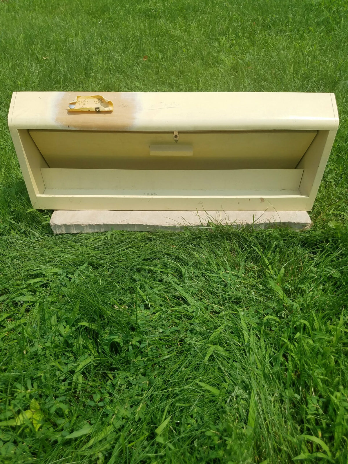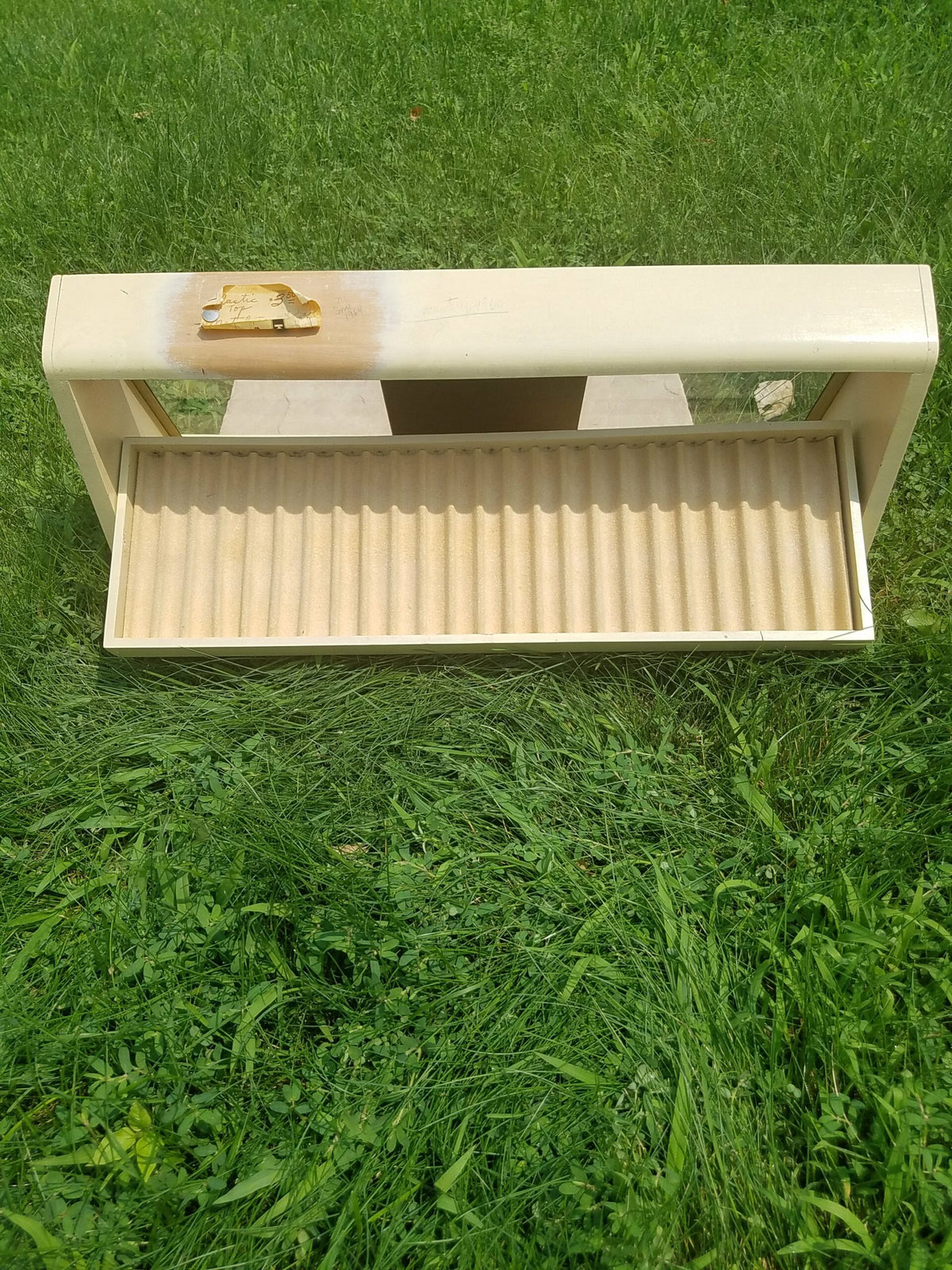 Overall very good condition. The glass is clean, the tray has virtually no staining aside from a few pencil tip marks where it rested. Looks like it was painted by the store, but the paint is very well done (they did leave an area unpainted where the the paper note is).