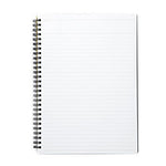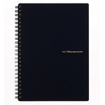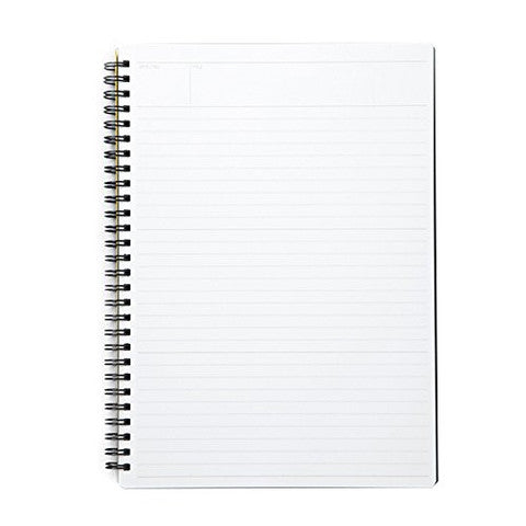 The notebook is composed of white acid free lined paper with "Title" and "Date/No" spaces at the top of each page. It has a double black wire side spiral binding matching the black plastic cover. Made in Japan.