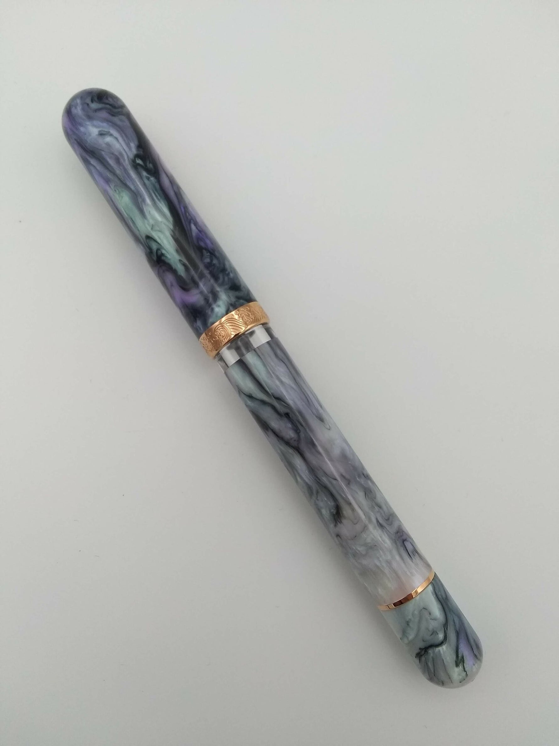 Featuring our classic voyage/nautilus collection design, this large, piston-fill fountain pen has a transparent ink window to view the amount of ink in the reservoir. The Voyage has a decorative cap band with a wave motif and the brand mark impressed on the metal surface. The Voyage is outfitted with stainless steel, number 6 size nib made in-house by Nahvalur.